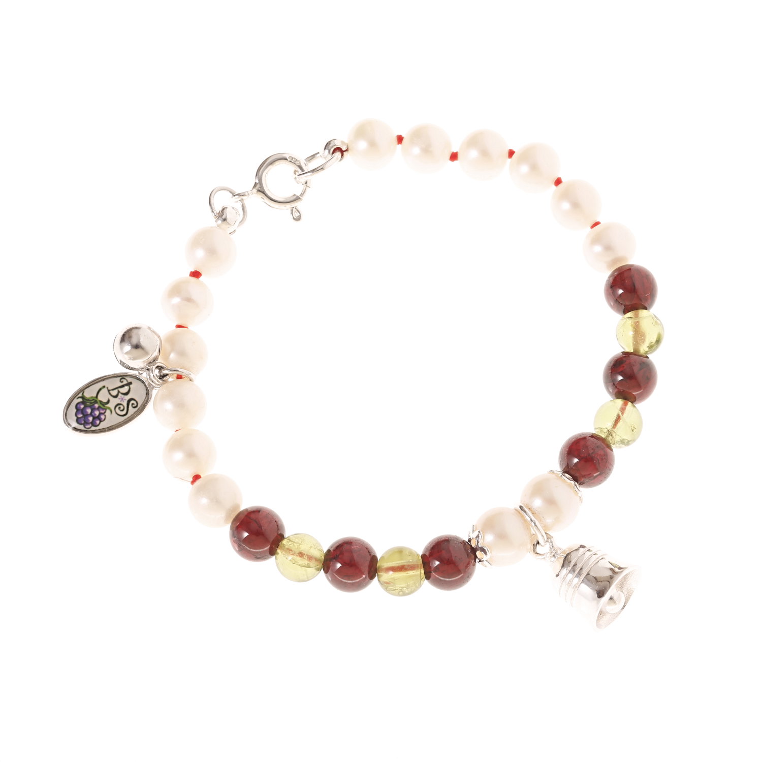 Weiße Süßwasser-Zuchtperlen (ca. 6mm), dunkelroter Granat (ca. 6mm), grüner Peridot (ca. 5mm). BS-Brombeer-Logo mit Glocke sowie Weihnachtsglocke (ca. 8*10mm) und andere Materialien aus 925 Silber.